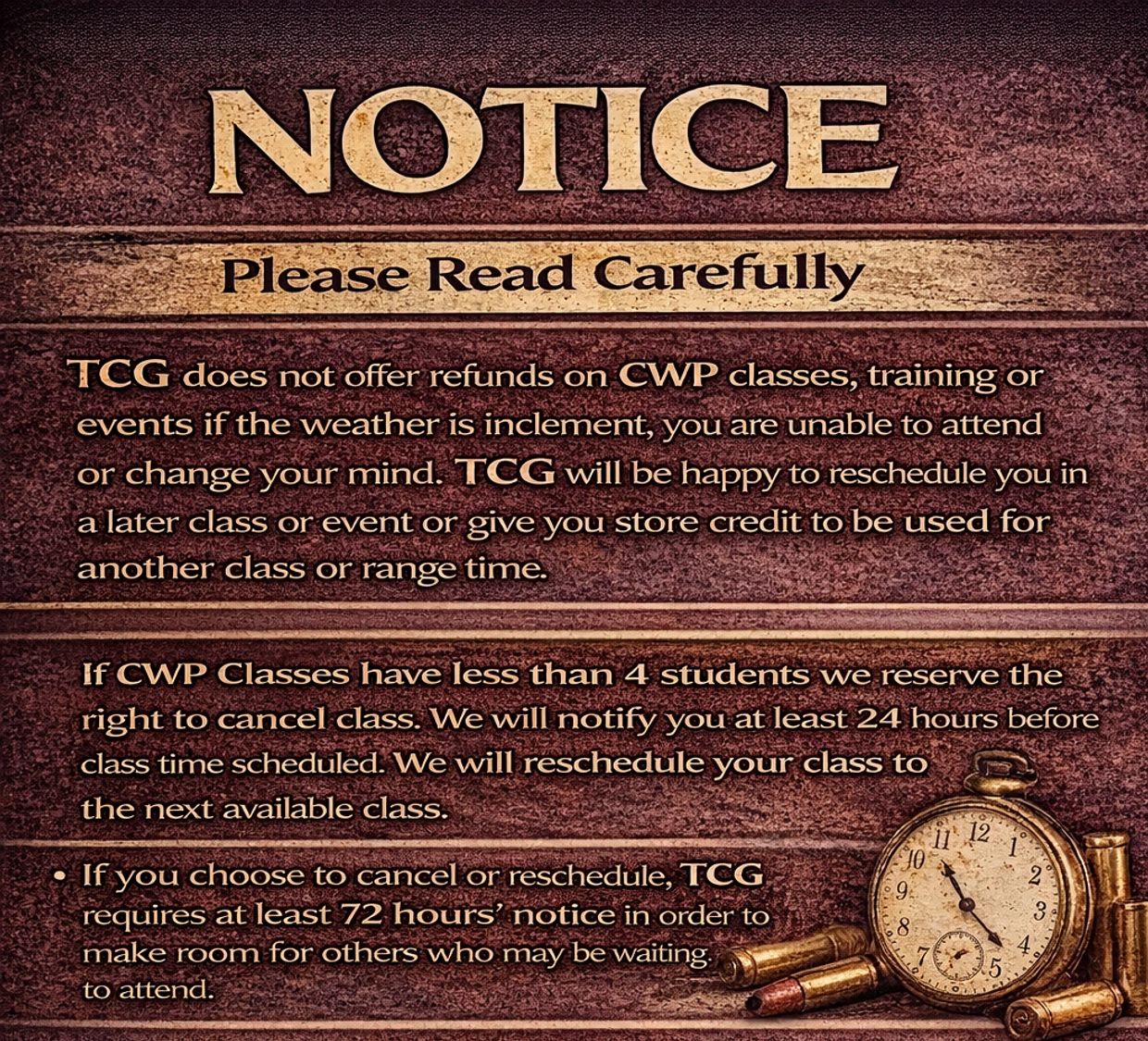 TCG does not offer refunds on CWP classes, training or events if the weather is inclement, you are unable to attend or change your mind. TCG will be happy to reschedule you in a later class or event or give you store credit to be used for another class or range time.