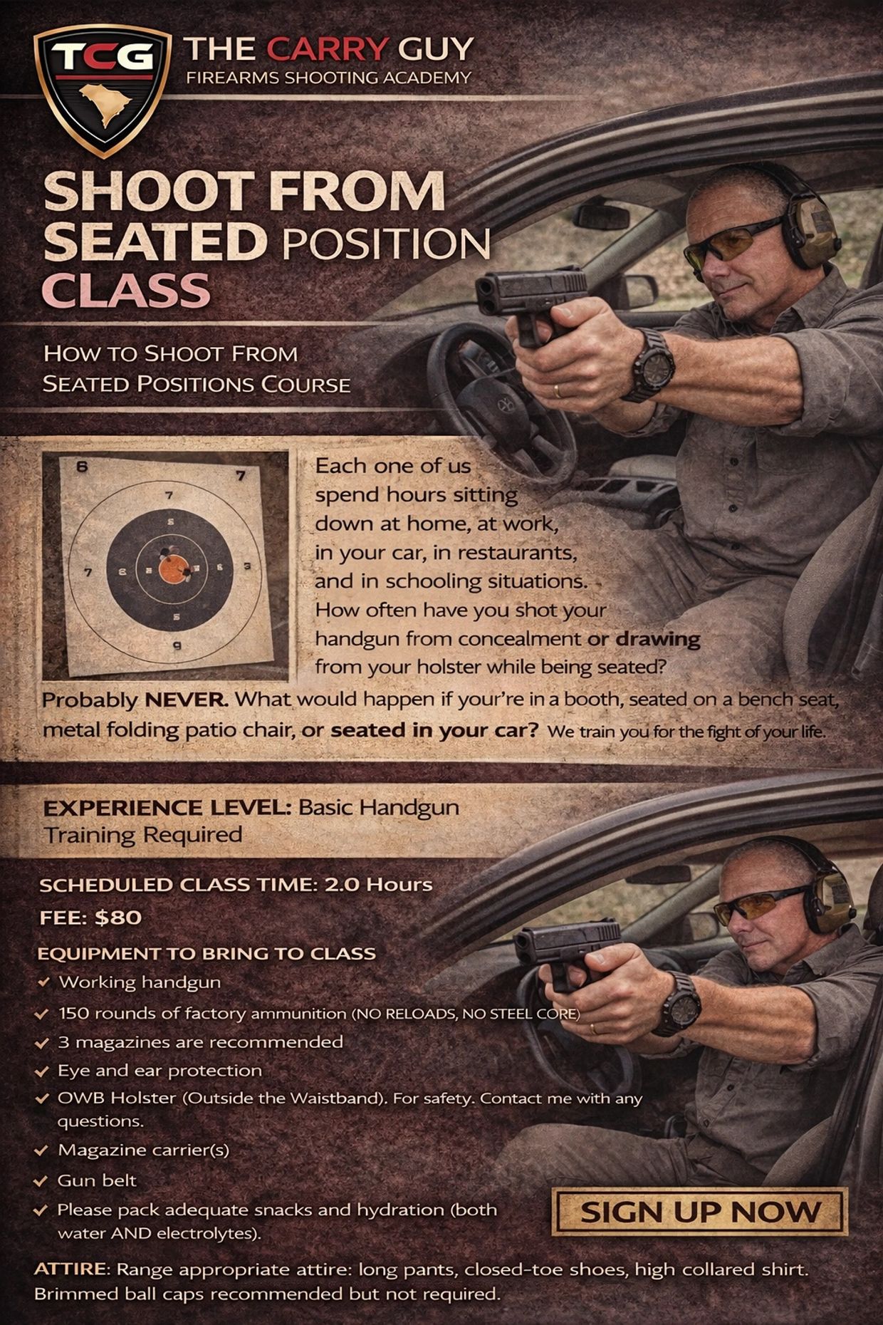 Each one of us spend hours sitting down at home, at work, in your car, in restaurants, and in schooling situations. How often have you shot your handgun from concealment or drawing from your holster while being seated? Probably NEVER. What would happen if your’re in a booth, seated on a bench seat, metal folding patio chair, or seated in your car? This class’s main goal is placed on personal skill building as well as working with communication techniques, your partner skill level, physical movement, and after the altercation, how to access what transpired. We train you for the fight of your life.