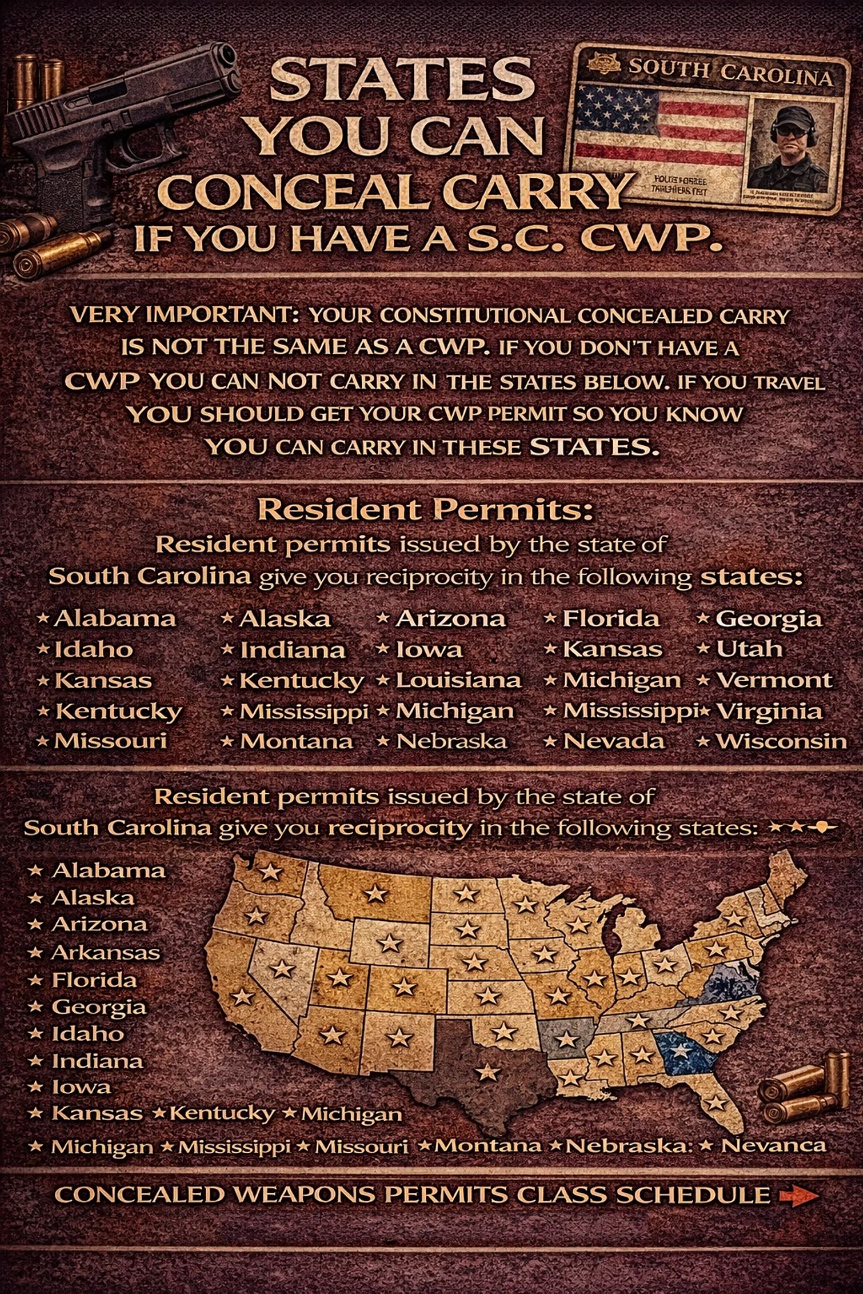 VERY IMPORTANT: YOUR CONSTITUTIONAL CONCEALED CARRY IS NOT THE SAME AS A CWP. IF YOU DON'T HAVE A CWP YOU CAN NOT CARRY IN THE STATES BELOW. IF YOU TRAVEL YOU SHOULD GET YOUR CWP PERMIT SO YOU KNOW YOU CAN CARRY IN THESE STATES.