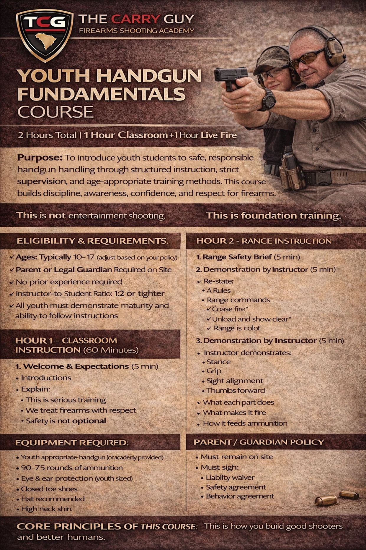 To introduce youth students to safe, responsible handgun handling through structured instruction, strict supervision, and age-appropriate training methods. This course builds discipline, awareness, confidence, and respect for firearms.
